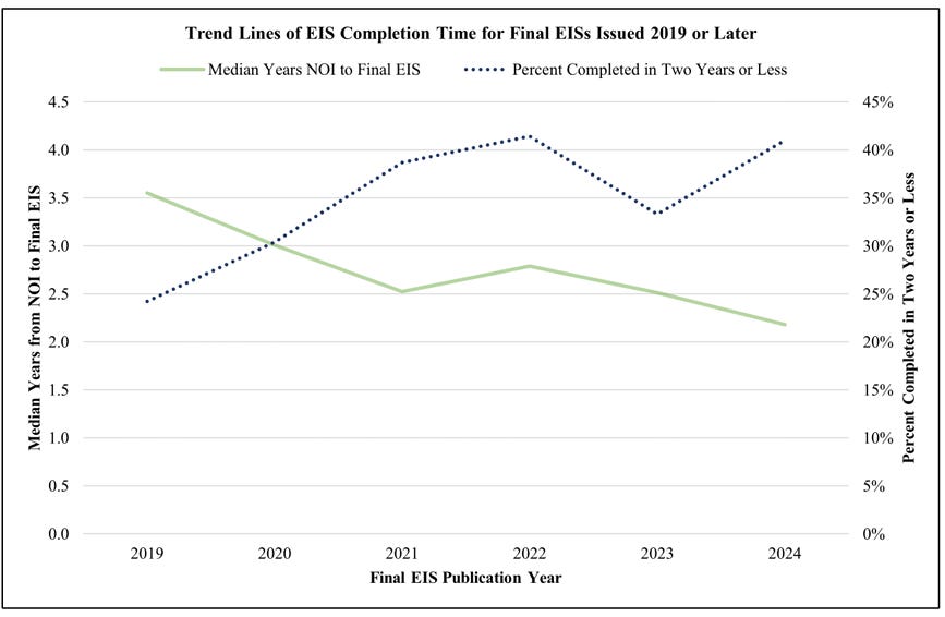 If one focuses on just NEPA alone, there is an argument to be made that “it was broken, and we are fixing it.” As shown in the figure below by the Council on Environmental Quality (2025), shorter approval times are real, as indicated by the decrease in time from when a company files a Notice of Intent (NOI) under NEPA rules to the time when a Environmental Impact Statement (EIS) has been issued. These changes mainly come from new statutory deadlines and regulatory guidance that cap review times and encourage more efficient documents and combined decisions. Additional funding from the Inflation Reduction Act has allowed agencies to hire NEPA staff, build specialized permitting teams, and improve coordination, directly addressing long-standing capacity constraints. Agencies like DOE and DOT have also streamlined their own procedures, using better project management, standardized templates, and early scoping to cut completion times for many EIS by roughly a quarter to one-half.